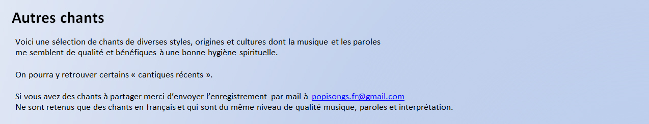 | Abba Père     | Aucun autre que toi     | Chantez au Seigneur un chant nouveau     | Chaque jour avec toi     |